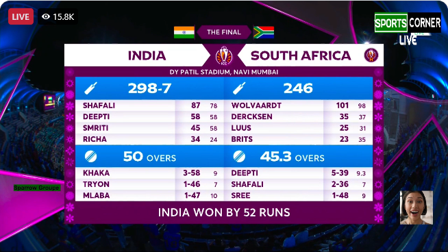 ফাইনালে দক্ষিণ আফ্রিকাকে ৫২ রানে হারাল ভারত। প্রথমে ব্যাট করে ভারত ৭ উইকেট হারিয়ে ২৯৮ রান করেন। জবাবে ৪৫.৩ ওভারে ২৪৬ রানে অল আউট হয়ে যায় দক্ষিণ আফ্রিকা।