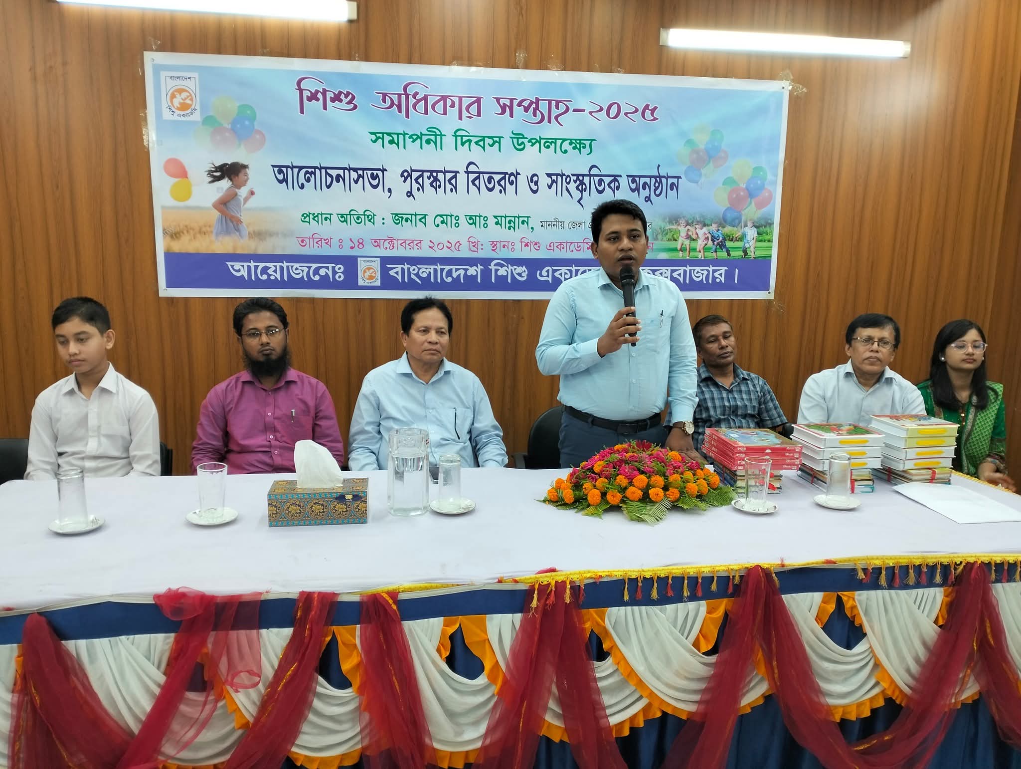 রোতাব চৌধূরী :: শিশু অধিকার সপ্তাহ-২০২৫ এর সমাপনী দিবস উপলক্ষ্যে কক্সবাজার জেলা শিশু একাডেমির আয়োজনে অনুষ্ঠিত হয়েছে আলোচনা সভা, পুরস্কার বিতরণ ও সাংস্কৃতিক অনুষ্ঠান।