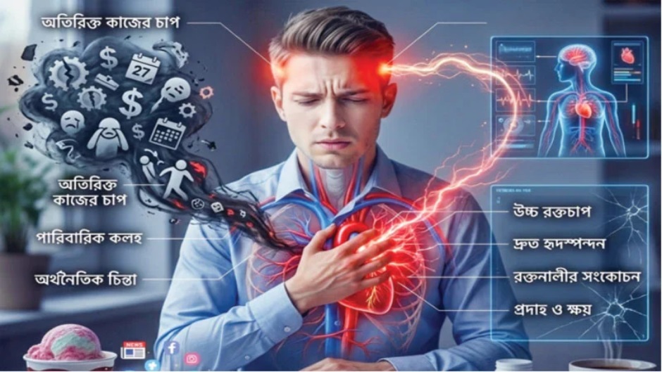 দীর্ঘমেয়াদি মানসিক চাপ বা স্ট্রেস উচ্চ রক্তচাপ, হৃদরোগ, স্ট্রোকসহ সংবহনতন্ত্রের বিভিন্ন জটিলতা তৈরি করে। কর্মক্ষেত্র, পারিবারিক সম্পর্ক বা অর্থনৈতিক দুশ্চিন্তা যদি দীর্ঘস্থায়ী হয়, তবে তা শরীরের ওপর খারাপ প্রভাব ফেলে।
