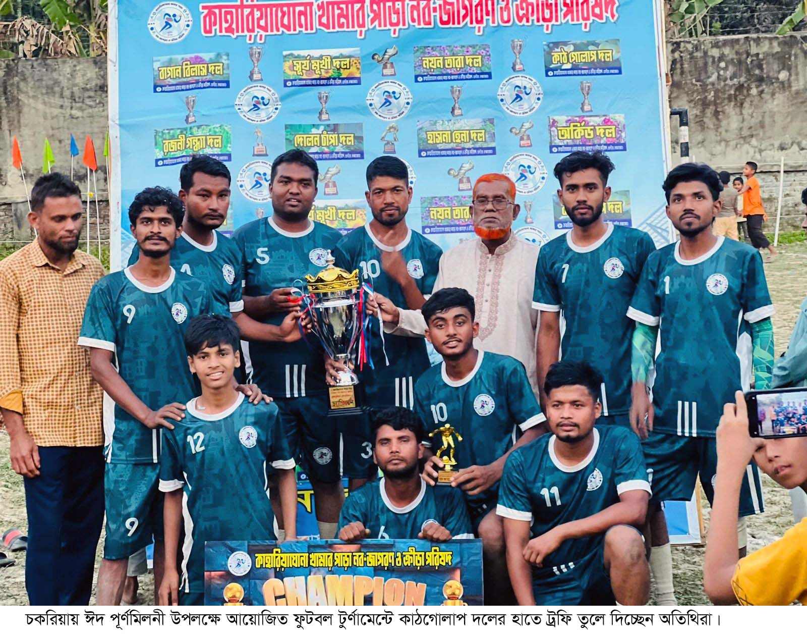 মুকুল কান্তি দাশ,চকরিয়া :: কক্সবাজারের চকরিয়া পৌরসভার কাহারিয়াঘোনা-খামার পাড়ায় ঈদের আনন্দকে আরও প্রাণবন্ত করে তুলতে তৃতীয় বারের মতো ২ দিনব্যাপী ঈদ পূর্ণমিলনী উপলক্ষে ফুটবল টুর্নামেন্ট জমকালো ও উৎসব মুখর পরিবেশে অনুষ্টিত হয়েছে। এতে চ্যাম্পিয়ন হওয়ার গৌরব অর্জন করেছে কাঠগোলাপ দল।